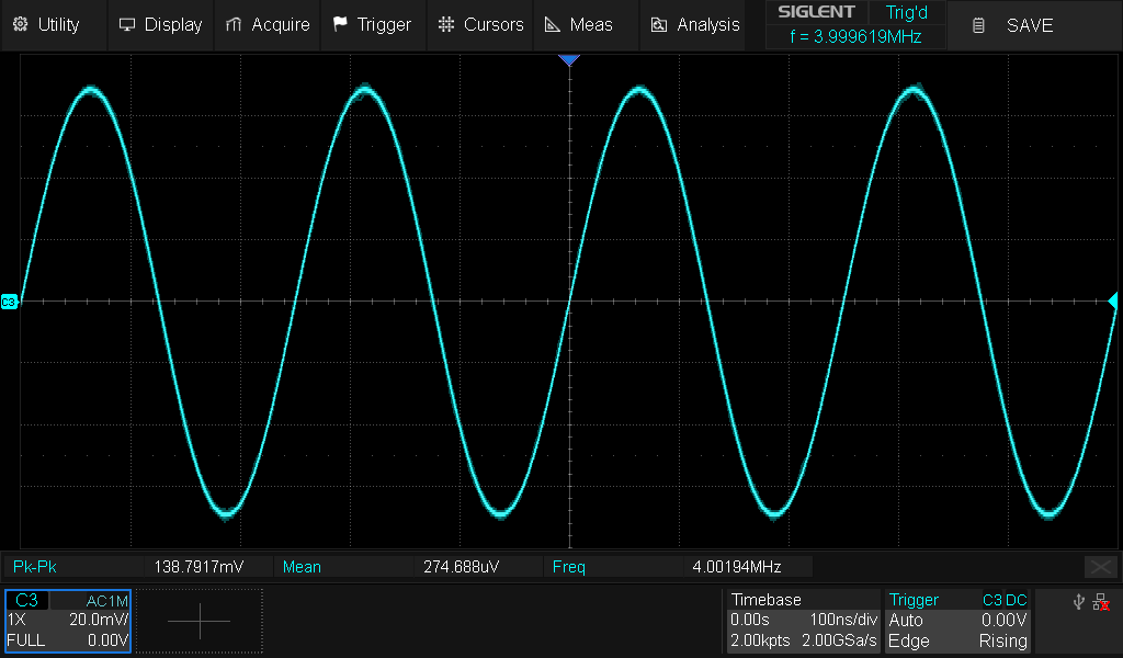 Scope in its box. It came with a calibration certificate, that was 3 weeks old, 4 scope probes, USB-B cable and a quick start manualSiglent SDS804X HD used as a logic analyzer for my thesisScope runningScope booting for the first timeScope running. Waveform of an 4MHz colpitts oscillator, distortedWaveform of an 4MHz colpitts oscillator, less distorted